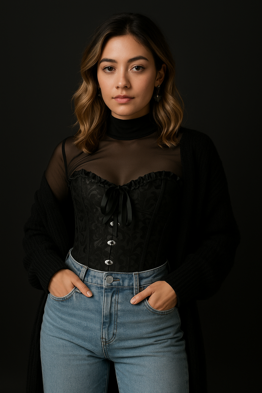 Este corset negro con textura floral combina sensualidad y estilo gĂłtico moderno.